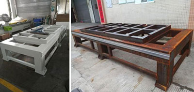 采用方鋼焊接,回火處理,消除焊接應力,保證使用多年后不會變形。床身加強筋比較密集,增加了床身強度,保證底板不變形。 |